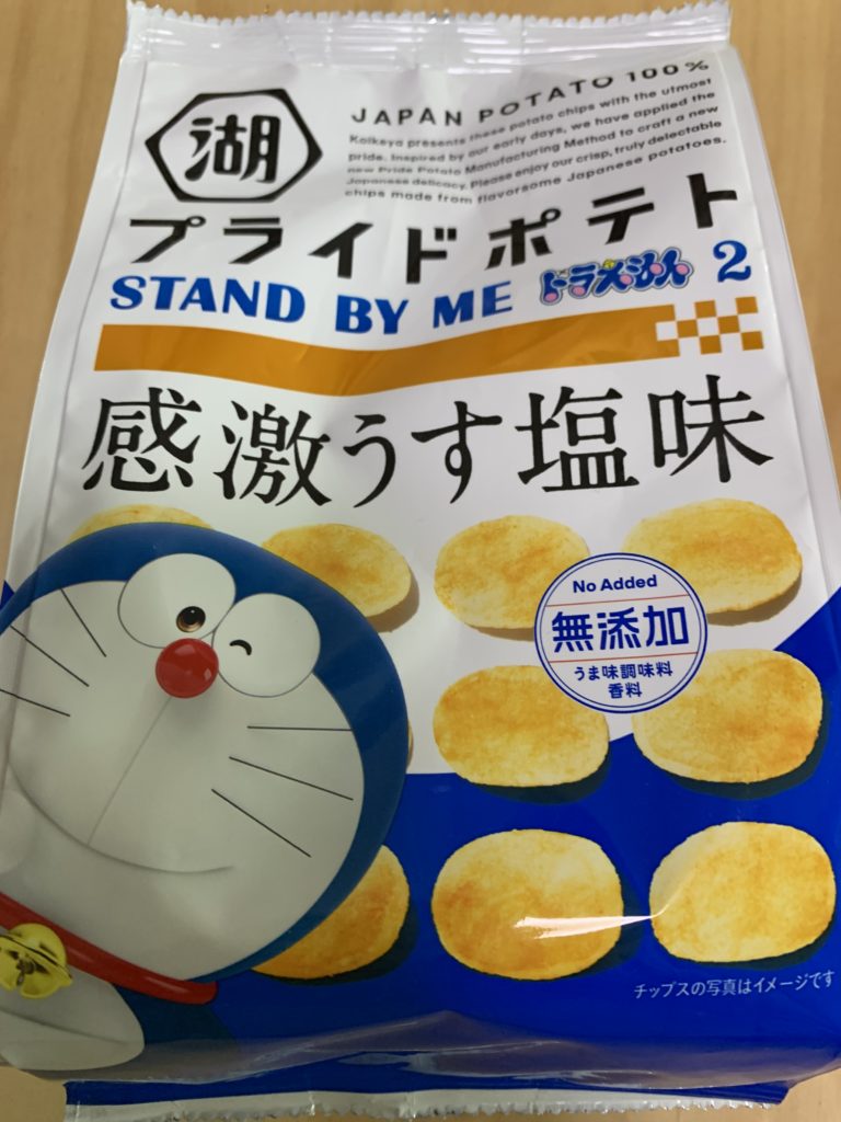 これは買うでしょ 見つけた瞬間 とびついたワタシ まるで初恋の人に出会ったように(よく わからない) 普段はカ○○―のポテトチップスを食べるけど今日は別 中身が少な目でもったいないけど、ドラえもんだから買う 感激うす塩味 衝撃のコンソメ