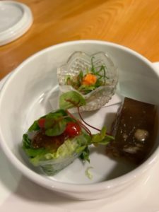 3種盛り クエ煮凝り クエ胃袋ポン酢かけ クエ生春巻き