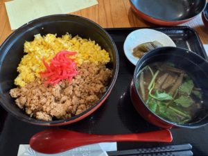 比内地鶏の鶏そぼろ丼。甘めの味付けが特徴かな。