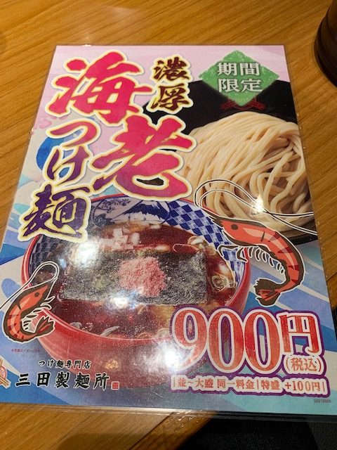 みーつけた 期間限定 濃厚海老つけ麺 麺は少ない~多いまで4段階 お値段は同一料金ですっ
